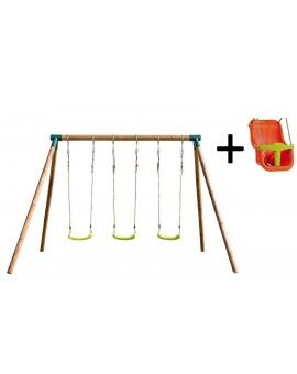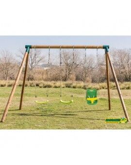 La estructura KIBO de la marca MASGAMES te presenta un columpio de madera con tres asientos homologados, diseñado especialmente para tu jardín.