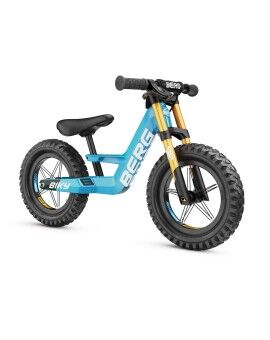 Las dos ruedas de neumático de 30 cm de diámetro con llantas de aluminio y la horquilla de la rueda frontal en color dorado le dan a nuestro BERG BIKY Cross Purple una imagen off-road que encantará a los pequeños exploradores.