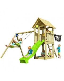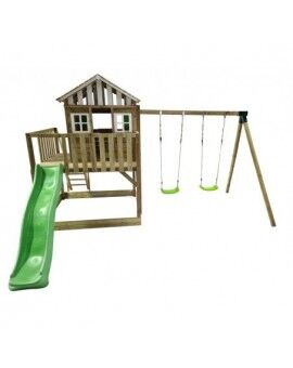 El conjunto incluye todas las maderas necesarias, una rampa de tobogán de color verde claro, anclajes para fijación en terrenos blandos, tapones de perno, manijas e instrucciones de montaje completas.