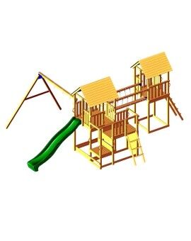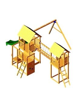 Esta estructura cuenta con una casita de madera elevada y dos tipos de escaleras para acceder a la plataforma. Una escalera vertical en la parte delantera y otra inclinada en la parte trasera. Una vez arriba, los niños pueden disfrutar de juegos, descanso y vigilancia, entre otras actividades. El descenso se realiza a través de un emocionante tobogán que los lleva rápidamente al suelo.